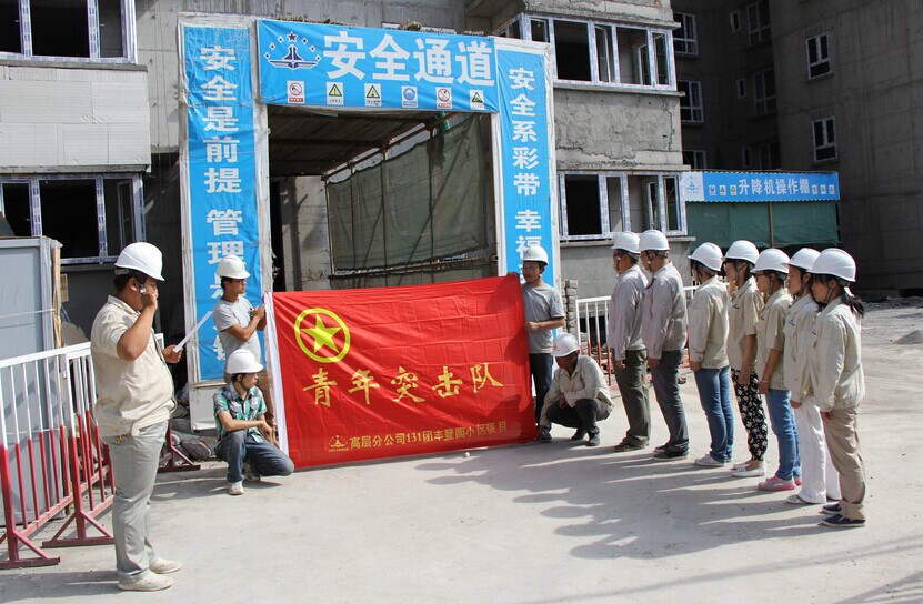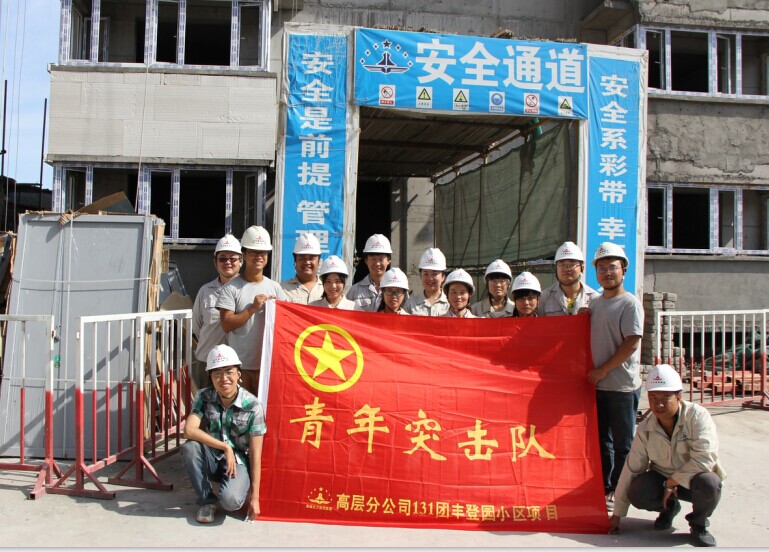 由高層分公司承建的131團豐登園小區住宅樓工程位于第七師高級中學(xué)對面,分別是1#、2#、5#、6#、7#、13#六棟高層,每棟均為地上十七層地下一層,建筑總面積高達74369.26平方米,項目部現有青年突擊隊員12人,占項目部總人數的80%。