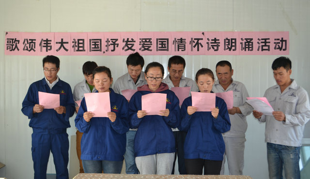 (通訊員 趙倩蘭)為了熱烈慶祝新中國成立65周年和新疆生產(chǎn)建設兵團成立60周年,北方建設集團油建分公司于9月26日開(kāi)展了“歌頌偉大祖國,抒發(fā)愛(ài)國情懷”詩(shī)朗誦和“唱響紅色經(jīng)典歌曲,培育員工愛(ài)國情懷”紅歌會(huì )活動(dòng)。